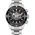 Хронограф Captain Cook оснащен характерным устойчивым к царапинам куполообразным сапфировым стеклом с антибликовым покрытием с обеих сторон. Элегантный корпус диаметром 43 мм из нержавеющей стали украшен безелемБезельВнешний ободок, закрепляющий стекло. В спортивных часах так называется поворотное кольцо с делениями на циферблате, выполняет роль таймера – замеряет отрезки времени на шкале. Неподвижный безель – элемент декора. Однонаправленно вращающийся безель на дайверских часах позволяет фиксировать моменты погружения и выныривания на поверхность., инкрустированным полированной черной высокотехнологичной керамикойВысокотехнологичная керамикаИнновационный запатентованный Rado материал с гладкой или матовой поверхностью. Керамика за счёт кристаллической структуры обладает повышенной устойчивостью от возникновения царапин. Материал способен принимать температуру тела человека, обеспечивая невероятный комфорт при ношении., которая дополняет серебристый и черный градиентный циферблат. На числа, маркеры и стрелки нанесено люминесцентное покрытиеЛюминесцентное покрытиеПозволяет считывать показания времени в темноте. Производители наносят на стрелки, часовые индексы, безель или поверхность циферблата светонакопительный состав, дающий холодное свечение. Super-LumiNova®. Внутри новый, более тонкий автоматический механизм R801 с 37 камнями, пятью стрелками и 59 часами запаса хода благодаря немагнитной пружине Nivachron™Nivachron™Специально разработанный инновационный сплав Nivachron™ повышает устойчивость часов к воздействию магнитных полей. превосходит стандартные требования к тестам с 3 до 5 положений для большей точности. Модель сопровождается полированным и матовым ремешком из нержавеющей стали, а также коричневым кожаным ремешком и дополнительным черным тканевым ремешком.