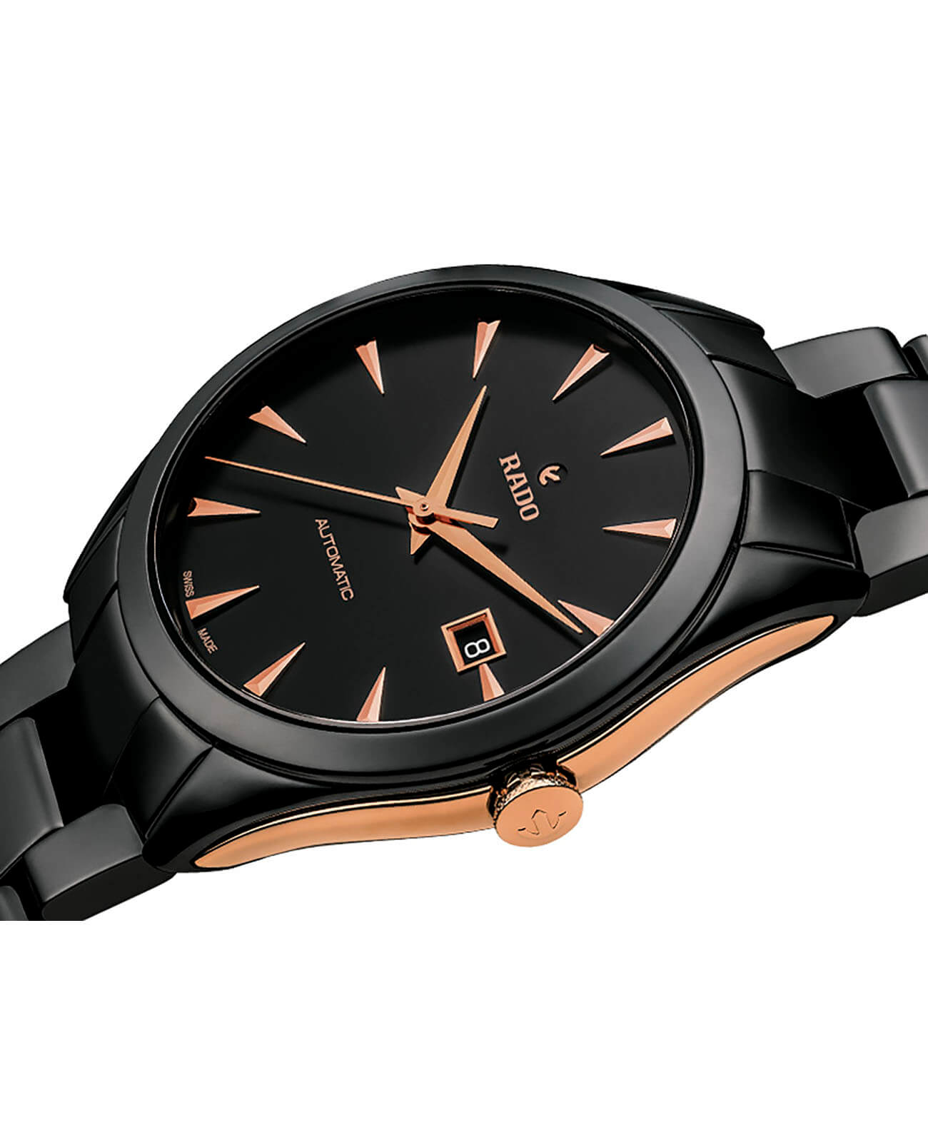 Корпус часов изготовлен из высококачественной стали с PVD-покрытиемPVDУльтратонкое покрытие наносится в технике вакуумного напыления, сочетает в себе нитрид титана особой прочности со слоем золота или оксида хрома. Несёт в себе декоративную или защитную функцию. и высокотехнологичной керамикиВысокотехнологичная керамикаИнновационный запатентованный Rado материал с гладкой или матовой поверхностью. Керамика за счёт кристаллической структуры обладает повышенной устойчивостью от возникновения царапин. Материал способен принимать температуру тела человека, обеспечивая невероятный комфорт при ношении., что обеспечивает их исключительную прочность и износоустойчивость. Такое сочетание материалов придаёт часам не только изысканную красоту, но и невероятную лёгкость, что делает их комфортными в носке.