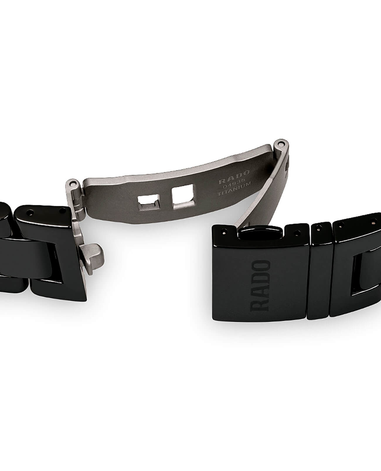 Браслет часов выполнен из высокотехнологичной керамикиВысокотехнологичная керамикаИнновационный запатентованный Rado материал с гладкой или матовой поверхностью. Керамика за счёт кристаллической структуры обладает повышенной устойчивостью от возникновения царапин. Материал способен принимать температуру тела человека, обеспечивая невероятный комфорт при ношении., что придаёт им дополнительную прочность и комфорт при ношении. Застёжка на раскладной застёжкеРаскладная застёжкаТакой тип застёжки используется только на браслетах из металла. Она никогда не раскрывается полностью, происходит разделение на 2 и более частей. Раскладывающая застёжка снизит вероятность потери часов к минимуму., что обеспечивает удобство.