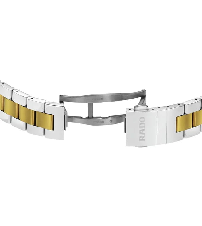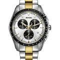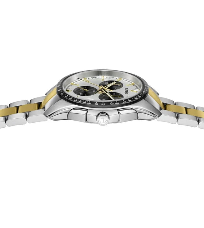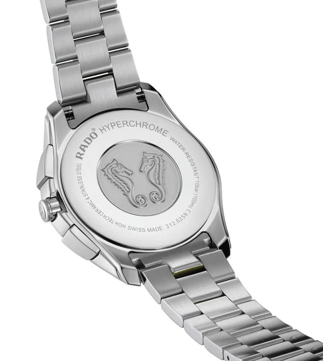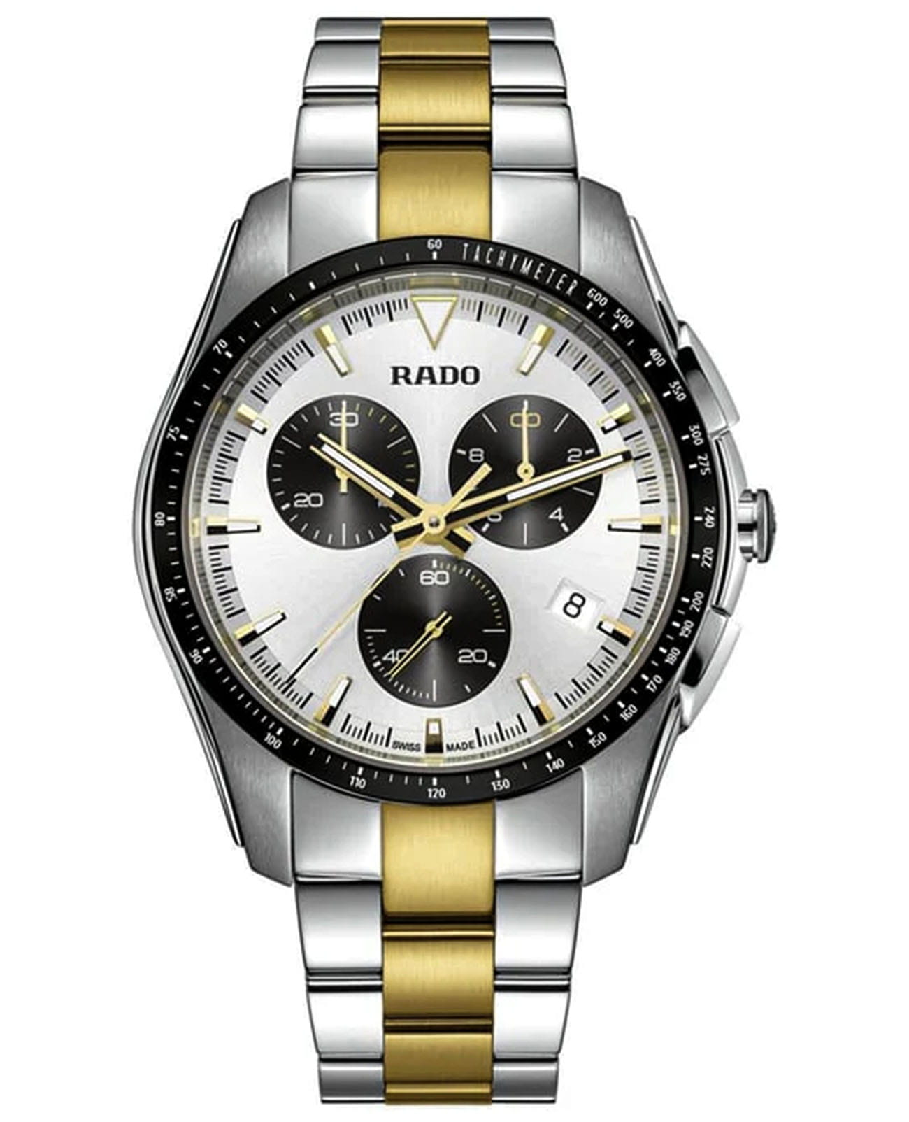 Мужские наручные часы-хронографХронографФункция позволяет измерять отрезки времени с особой точностью: часы, минуты, секунды. Верным признаком хронографа является наличие на циферблате 3 дополнительных окошек-счётчиков. Rado Hyperchrome Chronograph. Корпус часов изготовлен из нержавеющей стали. Стальной браслет с частичным PVD-покрытиемPVDУльтратонкое покрытие наносится в технике вакуумного напыления, сочетает в себе нитрид титана особой прочности со слоем золота или оксида хрома. Несёт в себе декоративную или защитную функцию. на застёжке «бабочка» с кнопкамиЗастёжка "бабочка"Такой вид застёжки дополняется предохранителями, помогающими избежать случайного раскрытия браслета. Обладают изящным исполнением. . БезельБезельВнешний ободок, закрепляющий стекло. В спортивных часах так называется поворотное кольцо с делениями на циферблате, выполняет роль таймера – замеряет отрезки времени на шкале. Неподвижный безель – элемент декора. Однонаправленно вращающийся безель на дайверских часах позволяет фиксировать моменты погружения и выныривания на поверхность. со шкалой тахиметраТахиметрРазмеченная шкала, располагается на ободке или безеле часов. Тахиметр позволяет рассчитать скорость на определённом участке пути, расстояние измеряется в километрах или милях.. Окошко даты находится в положении 4 часа. Стрелки и метки с люминесцентным покрытиемЛюминесцентное покрытиеПозволяет считывать показания времени в темноте. Производители наносят на стрелки, часовые индексы, безель или поверхность циферблата светонакопительный состав, дающий холодное свечение.. Сапфировое стеклоСапфировое стеклоПрочный и надёжный материал из кристалла сапфира синтетического происхождения, характеризующийся особой твёрдостью и устойчивостью к царапинам и повреждениям. с антибликовым покрытиемАнтибликовое покрытиеСлой оксида металла в 0,13-0,3 микрон, благодаря которому стекло часов не бликует и не отражает свет. Антибликовое покрытие уменьшает отражение света в 10 раз, обеспечивая отличную читаемость показателей циферблата. устойчивое к мелким механическим повреждениям. Класс водозащиты: 100 метров, позволит плавать, нырять и заниматься другими водными видами спорта.
