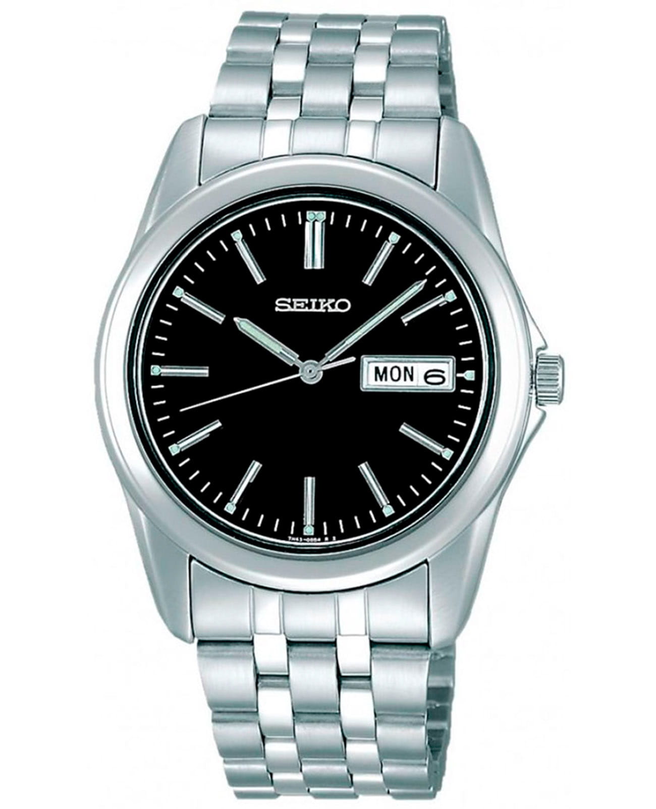 Мужские кварцевые часы Seiko — это элегантный аксессуар в классическом стиле. Корпус размером 38×38 мм и толщиной 8 мм выполнен из нержавеющей стали. Циферблат серебристого цвета оформлен индексами и стрелками. Указатели дня недели и даты вынесены на отдельные субциферблаты. Стрелки и метки с люминесцентным покрытиемЛюминесцентное покрытиеПозволяет считывать показания времени в темноте. Производители наносят на стрелки, часовые индексы, безель или поверхность циферблата светонакопительный состав, дающий холодное свечение., обеспечивающим хорошую читаемость в темноте. Циферблат защищён прочным защищён минеральным стекломМинеральное стеклоМинеральное стекло представляет собой искусственно выращенный минерал кварца. Такое стекло отличается особой устойчивостью к повреждениям и царапинам. Уступает по некоторым качествам сапфировому стеклу. от компании Seiko. Часы оснащены стальным браслетом с раскладной застёжкойРаскладная застёжкаТакой тип застёжки используется только на браслетах из металла. Она никогда не раскрывается полностью, происходит разделение на 2 и более частей. Раскладывающая застёжка снизит вероятность потери часов к минимуму.. Водонепроницаемость 30 м позволяет использовать часы в повседневных условиях. Идеальный выбор для тех, кто ценит японское качество и лаконичный дизайн.