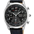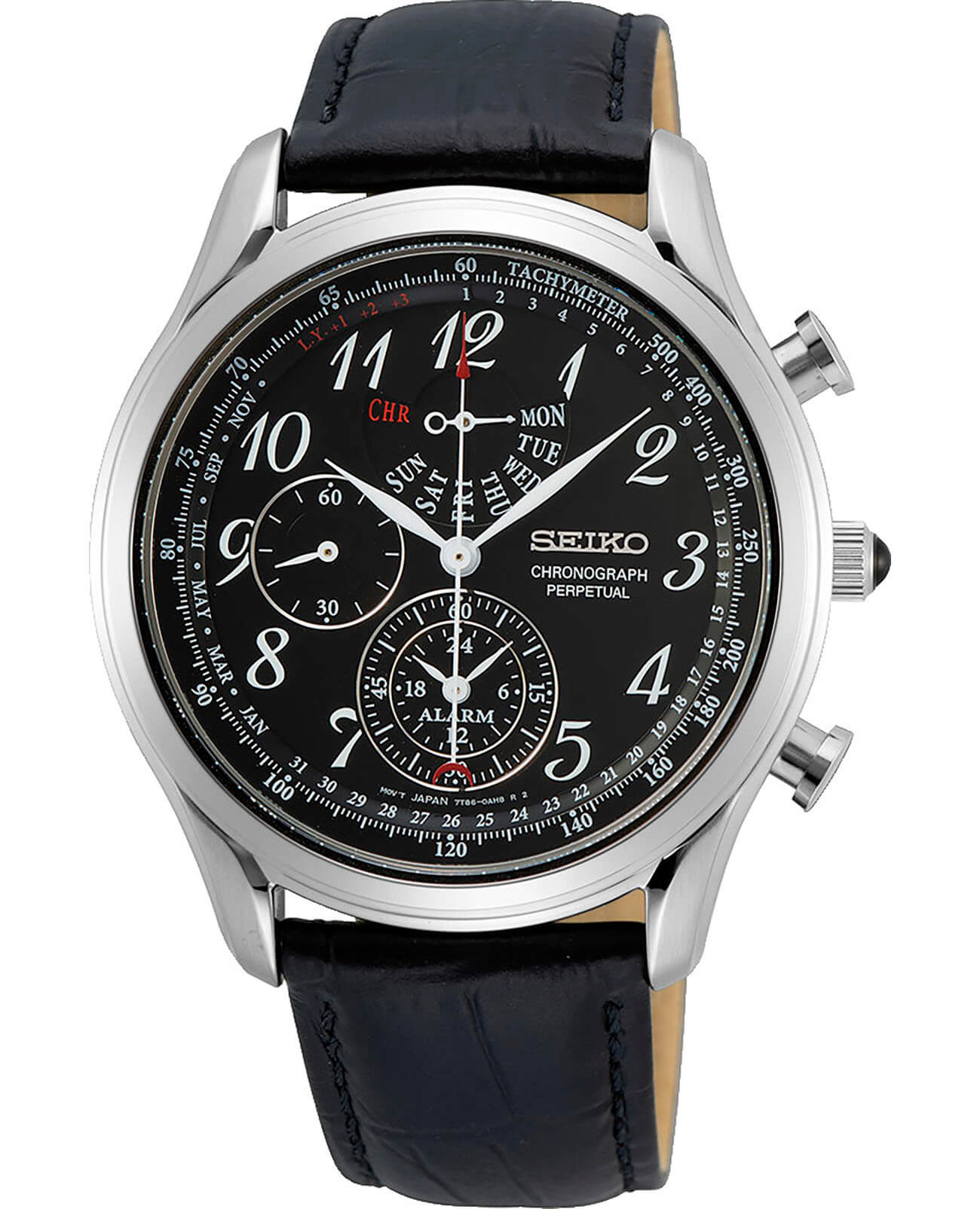 Элегантный хронографХронографФункция позволяет измерять отрезки времени с особой точностью: часы, минуты, секунды. Верным признаком хронографа является наличие на циферблате 3 дополнительных окошек-счётчиков. дополнен спортивными деталями: шкала тахиметраТахиметрРазмеченная шкала, располагается на ободке или безеле часов. Тахиметр позволяет рассчитать скорость на определённом участке пути, расстояние измеряется в километрах или милях., отображение даты, ретроградный указатель дня недели, окошко будильника и секундомера. Аксессуар будет одинаково хорошо дополнять как повседневный, так и деловой образ. Чёрный ремешок из натуральной кожи гармонично сочетается с отполированным кабашоном на заводной головке. Циферблат защищён прочным минеральным стеклом Hardlex, отличающимся устойчивостью к царапинам. В основе работы – кварцевый японский механизм Seiko 7T86. Надёжный корпус из нержавеющей стали 316L выдерживает высокие нагрузки. Наручные часы сохраняют водонепроницаемость при давлении 50 бар. Диаметр корпуса: 40 мм.