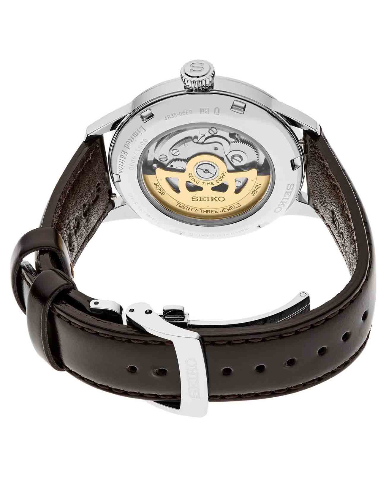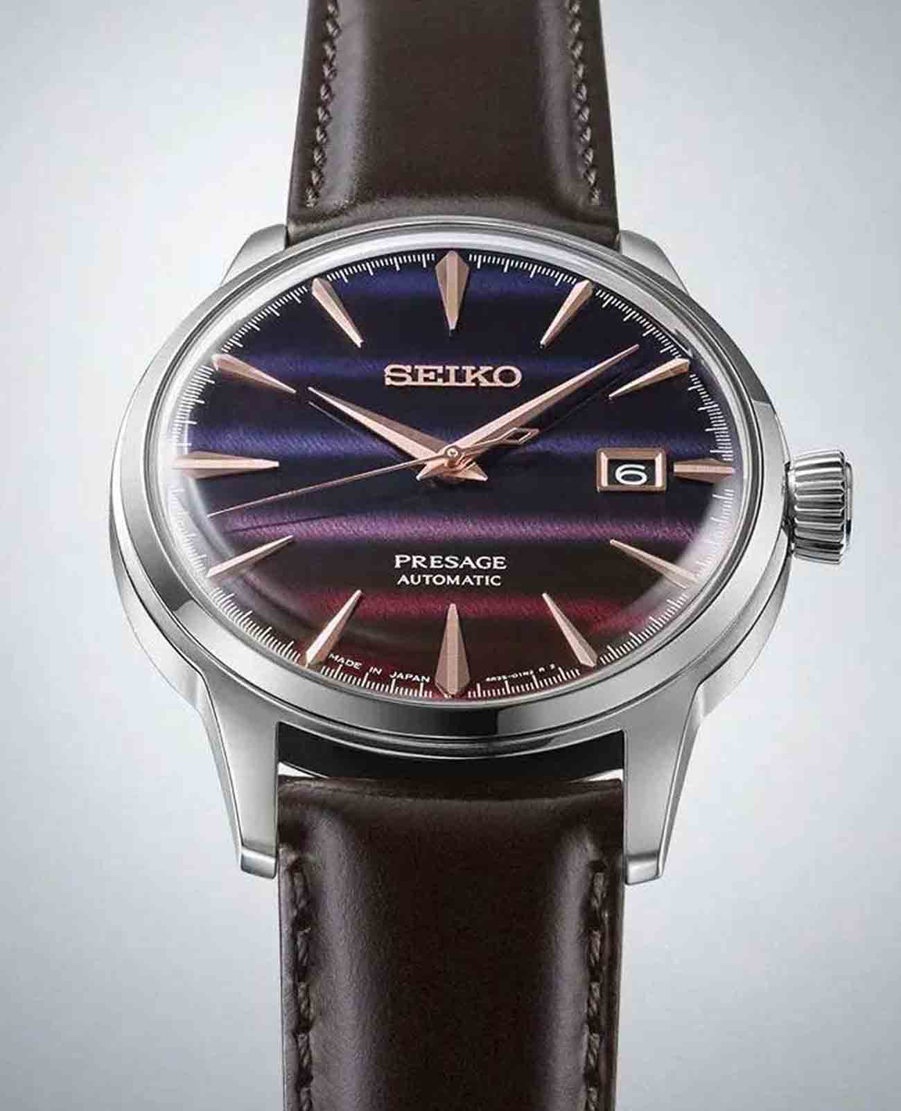 Мужские японские механические часы Seiko Presage SRPK75J1 с минеральным стекломМинеральное стеклоМинеральное стекло представляет собой искусственно выращенный минерал кварца. Такое стекло отличается особой устойчивостью к повреждениям и царапинам. Уступает по некоторым качествам сапфировому стеклу. — это лимитированное издание, выпущенное всего в 9 000 экземплярах. Корпус часов изготовлен из высококачественной стали, что обеспечивает их долговечность и надежность. Эта модель вдохновлена японской культурой коктейлей и особым миром напитков знаменитого бара Star, где работает известный бармен Хисаши Киши. Он славится своими мастерскими сочетаниями японских и международных вкусов. Цветовая палитра часов навеяна коктейлем Purple Sunset, что придает им особую утонченность и элегантность. Секундная стрелка выполнена в форме палочки для перемешивания коктейлей, подчеркивая связь с тематикой бара. В механизме часов используется 23 камня, частота колебаний составляет 21 600 полуколебаний в час, а запас хода достигает 41 часа. Также предусмотрена возможность ручного завода, что добавляет удобства в управлении часами. Окошко даты располагается на отметке 3 часа, обеспечивая удобный доступ к информации о текущей дате. Класс водозащиты — 50 метров, что защитит часы от случайных брызг воды или капель дождя. Кожаный ремешок на раскладной застёжкеРаскладная застёжкаТакой тип застёжки используется только на браслетах из металла. Она никогда не раскрывается полностью, происходит разделение на 2 и более частей. Раскладывающая застёжка снизит вероятность потери часов к минимуму. завершает образ, делая эти часы идеальным аксессуаром для любого случая.