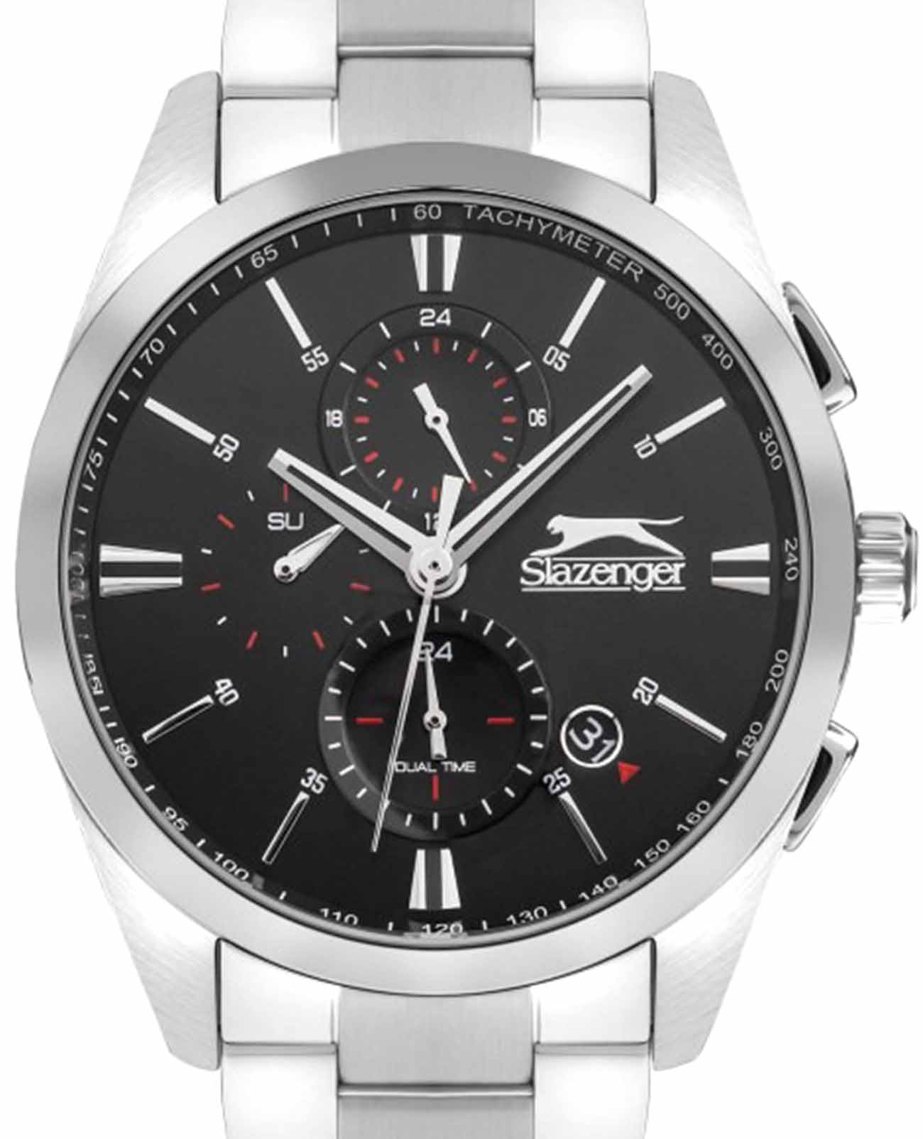 Часы Slazenger SL.09.2215.2.02 представляют собой стильные мужские наручные часы, которые сочетают в себе элегантный дизайн и функциональность. Изготовленные в Англии, эти кварцевые часы оснащены прочным металлическим корпусом и металлическим браслетом с раскладной застёжкойРаскладная застёжкаТакой тип застёжки используется только на браслетах из металла. Она никогда не раскрывается полностью, происходит разделение на 2 и более частей. Раскладывающая застёжка снизит вероятность потери часов к минимуму., который обеспечивает надежную фиксацию на запястье. Минеральное стеклоМинеральное стеклоМинеральное стекло представляет собой искусственно выращенный минерал кварца. Такое стекло отличается особой устойчивостью к повреждениям и царапинам. Уступает по некоторым качествам сапфировому стеклу. защищает черный циферблат от царапин, а водозащита WR 50 позволяет использовать их в условиях повышенной влажности. Диаметр корпуса составляет 43 мм, а толщина — 14 мм, что делает часы удобными для ежедневного ношения. Ширина ремешка — 22 мм, что обеспечивает комфорт и стильный вид на руке. Дополнительные функции включают отображение второго часового поясаВторой часовой поясФункция, позволяющая отображать время двух часовых поясов одновременно., дня недели и текущего времени в 24-часовом формате, а также наличие окошка даты для удобства пользователя. Стрелки снабжены люминесцентным покрытиемЛюминесцентное покрытиеПозволяет считывать показания времени в темноте. Производители наносят на стрелки, часовые индексы, безель или поверхность циферблата светонакопительный состав, дающий холодное свечение., что позволяет легко считывать время в темноте. Часы также оснащены тахиметромТахиметрРазмеченная шкала, располагается на ободке или безеле часов. Тахиметр позволяет рассчитать скорость на определённом участке пути, расстояние измеряется в километрах или милях., что добавляет им функциональности и может быть полезно для измерения скорости.