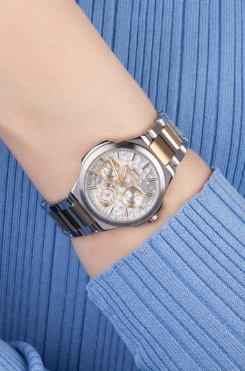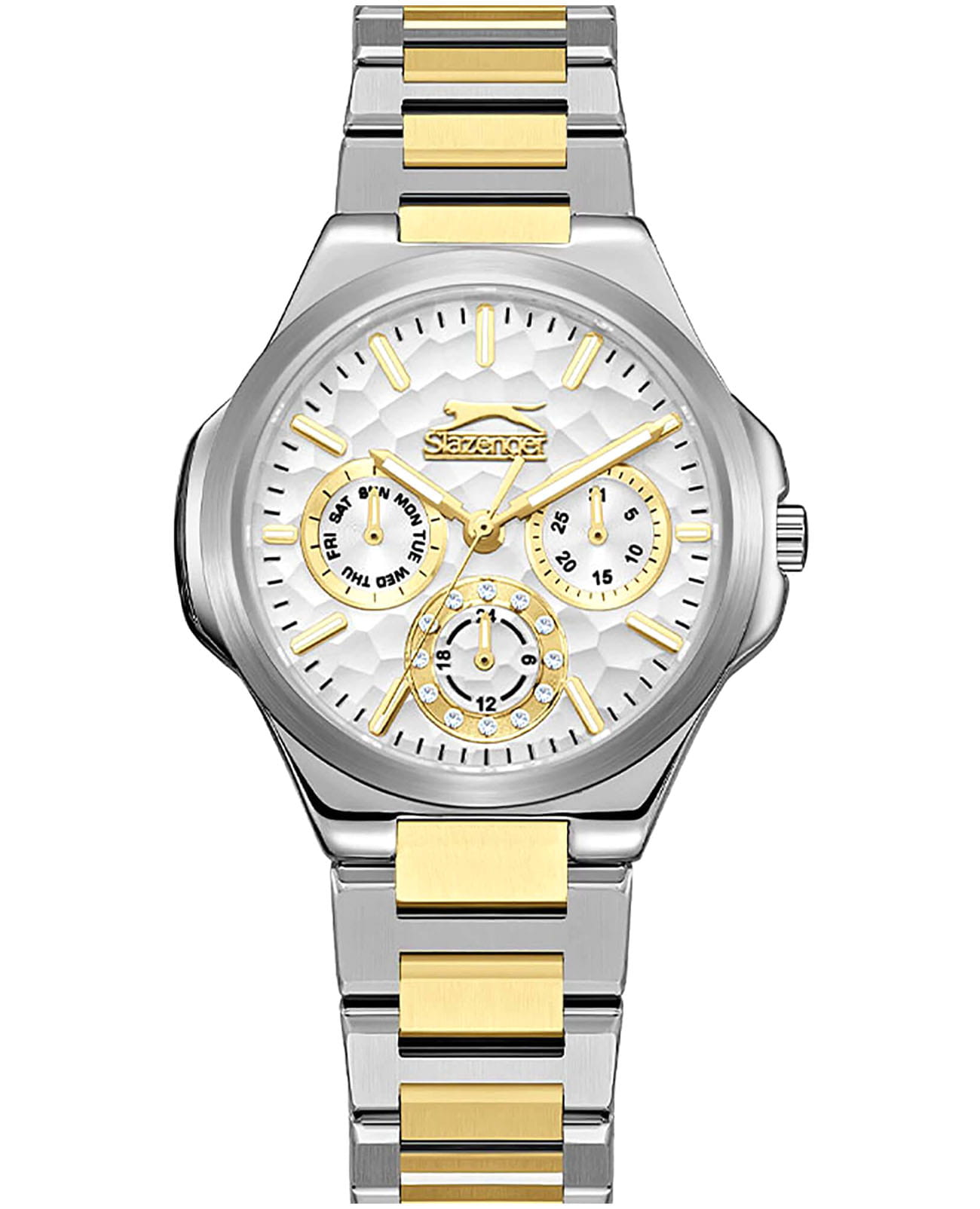 Женские кварцевые часы Slazenger SL.09.2365.4.07 – это сочетание элегантности, современного стиля и надёжности. Изящный корпус из суперметалла серебристого цвета, диаметром 33 мм и толщиной 10 мм, подчёркивает утончённость модели и делает их идеальным аксессуаром для любой ситуации – будь то деловая встреча, романтический вечер или повседневные выходы. Циферблат надёжно защищён минеральным стекломМинеральное стеклоМинеральное стекло представляет собой искусственно выращенный минерал кварца. Такое стекло отличается особой устойчивостью к повреждениям и царапинам. Уступает по некоторым качествам сапфировому стеклу., которое устойчиво к механическим повреждениям и сохраняет кристальную прозрачность. Браслет из суперметалла с частичным IP-покрытиемIP-покрытиеМетод ионного напыления. Демонстрирует повышенную устойчивость к истиранию, окислению и химическим веществам. Под воздействием высокого давления и температуры около 1500°C молекулы металла надёжно соединяются с частицами корпуса часов. золотистого цвета удобно облегает запястье и фиксируется с помощью раскладной застёжкиРаскладная застёжкаТакой тип застёжки используется только на браслетах из металла. Она никогда не раскрывается полностью, происходит разделение на 2 и более частей. Раскладывающая застёжка снизит вероятность потери часов к минимуму., обеспечивая надёжность и комфорт в повседневном ношении. Утончённый стиль, внимание к деталям и практичность делают эту модель идеальным выбором для современных женщин, ценящих эстетику и функциональность. Стрелки и метки покрыты люминесцентным покрытиемЛюминесцентное покрытиеПозволяет считывать показания времени в темноте. Производители наносят на стрелки, часовые индексы, безель или поверхность циферблата светонакопительный состав, дающий холодное свечение., обеспечивающим отличную читаемость в темноте. Вынесенный циферблат с 24-х часовым указателем времени украшен фианитами. Водозащита до 30 метров позволит защитить корпус от случайных брызг или капель дождя.