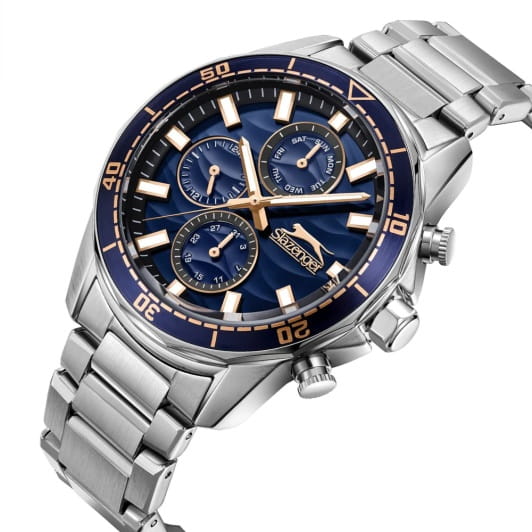 Мужские кварцевые часы Slazenger — это выразительный и функциональный аксессуар. Корпус диаметром 41,5 мм и толщиной 13 мм выполнен из суперметалла. Циферблат синего цвета оформлен индексами и стрелками. Циферблат защищён минеральным стекломМинеральное стеклоМинеральное стекло представляет собой искусственно выращенный минерал кварца. Такое стекло отличается особой устойчивостью к повреждениям и царапинам. Уступает по некоторым качествам сапфировому стеклу.. Механизм — кварцевый. Часы оснащены индикацией дня недели, даты и 12/24-часового формата времени. Стрелки и метки с люминесцентным покрытиемЛюминесцентное покрытиеПозволяет считывать показания времени в темноте. Производители наносят на стрелки, часовые индексы, безель или поверхность циферблата светонакопительный состав, дающий холодное свечение., обеспечивающим хорошую читаемость в темноте. Часы оснащены браслетом из суперметалла с раскладной застёжкойРаскладная застёжкаТакой тип застёжки используется только на браслетах из металла. Она никогда не раскрывается полностью, происходит разделение на 2 и более частей. Раскладывающая застёжка снизит вероятность потери часов к минимуму.. Водонепроницаемость 100 м позволяет использовать часы для плавания и повседневного ношения. Гарантия — 12 месяцев. Идеальный выбор для тех, кто ценит стиль, функциональность и качество.
