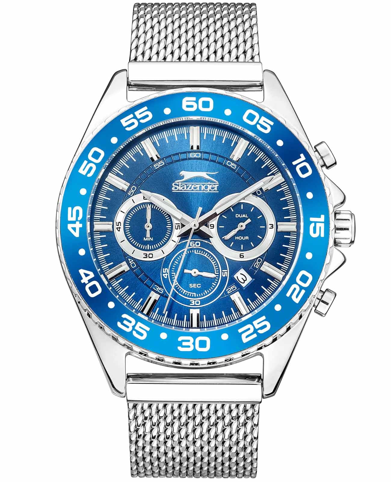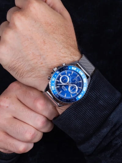 Часы Slazenger SL.09.6528.2.03 — это стильный и надежный хронографХронографФункция позволяет измерять отрезки времени с особой точностью: часы, минуты, секунды. Верным признаком хронографа является наличие на циферблате 3 дополнительных окошек-счётчиков., который подчеркивает индивидуальность своего владельца. Изысканный корпус и браслет выполнены из прочного суперметалла. Циферблат надежно защищен минеральным стекломМинеральное стеклоМинеральное стекло представляет собой искусственно выращенный минерал кварца. Такое стекло отличается особой устойчивостью к повреждениям и царапинам. Уступает по некоторым качествам сапфировому стеклу., устойчивым к царапинам и механическим повреждениям. Модель оснащена кварцевым механизмом, что гарантирует высокую точность хода. На отдельные циферблаты вынесены указатели 24-часового времени, что делает использование часов особенно удобным в повседневной жизни. БезельБезельВнешний ободок, закрепляющий стекло. В спортивных часах так называется поворотное кольцо с делениями на циферблате, выполняет роль таймера – замеряет отрезки времени на шкале. Неподвижный безель – элемент декора. Однонаправленно вращающийся безель на дайверских часах позволяет фиксировать моменты погружения и выныривания на поверхность. с IP-покрытиемIP-покрытиеМетод ионного напыления. Демонстрирует повышенную устойчивость к истиранию, окислению и химическим веществам. Под воздействием высокого давления и температуры около 1500°C молекулы металла надёжно соединяются с частицами корпуса часов. синего цвета. Браслет с раскладным замкомРаскладная застёжкаТакой тип застёжки используется только на браслетах из металла. Она никогда не раскрывается полностью, происходит разделение на 2 и более частей. Раскладывающая застёжка снизит вероятность потери часов к минимуму., обеспечивающей комфортную посадку. Водозащита 5 АТМ позволяет не беспокоиться о случайных брызгах или дожде. Стрелки и метки покрыты люминесцентным покрытиемЛюминесцентное покрытиеПозволяет считывать показания времени в темноте. Производители наносят на стрелки, часовые индексы, безель или поверхность циферблата светонакопительный состав, дающий холодное свечение., обеспечивающим отличную читаемость в темноте. Диаметр корпуса составляет 45 мм, толщина — 12 мм, что обеспечивает комфортное ношение на запястье. Часы станут отличным выбором для повседневного использования или дополнения к деловому образу, а также послужат отличным подарком на любой праздник.