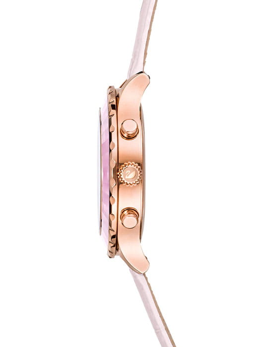 Женские часы Swarovski Octea Lux Chrono 5452501 – это роскошные часы с секундомеромСекундомерСекундоме́р — прибор, способный измерять интервалы времени с точностью до долей секунды. и хронографомХронографФункция позволяет измерять отрезки времени с особой точностью: часы, минуты, секунды. Верным признаком хронографа является наличие на циферблате 3 дополнительных окошек-счётчиков., поистине, образец точности и роскоши, ведь они сочетают в себе лучшие традиции швейцарского часового искусства и неповторимое мастерство Swarovski. Прекрасный аксессуар, подходящий к любому повседневному образу. Часы имеют функцию хронографаХронографФункция позволяет измерять отрезки времени с особой точностью: часы, минуты, секунды. Верным признаком хронографа является наличие на циферблате 3 дополнительных окошек-счётчиков., позволяющую запустить отсчет, остановить его и обнулить результаты. Корпус из нержавеющей стали с PVDPVDУльтратонкое покрытие наносится в технике вакуумного напыления, сочетает в себе нитрид титана особой прочности со слоем золота или оксида хрома. Несёт в себе декоративную или защитную функцию. покрытием оттенка розового золота гармонично сочетается с огранённым кристальным безелемБезельВнешний ободок, закрепляющий стекло. В спортивных часах так называется поворотное кольцо с делениями на циферблате, выполняет роль таймера – замеряет отрезки времени на шкале. Неподвижный безель – элемент декора. Однонаправленно вращающийся безель на дайверских часах позволяет фиксировать моменты погружения и выныривания на поверхность., который встречается только в коллекции часов Swarovski. Его светло-розовое сияние удачно сочетается с розовым циферблатом с рисунком в виде солнечных лучей и ремешком из натуральной кожи с тиснением под крокодила. Надежное минеральное стеклоМинеральное стеклоМинеральное стекло представляет собой искусственно выращенный минерал кварца. Такое стекло отличается особой устойчивостью к повреждениям и царапинам. Уступает по некоторым качествам сапфировому стеклу. защищает часы от царапин и долго сохраняет первоначальный внешний вид. На часовую, минутную стрелки нанесено люминесцентное покрытиеЛюминесцентное покрытиеПозволяет считывать показания времени в темноте. Производители наносят на стрелки, часовые индексы, безель или поверхность циферблата светонакопительный состав, дающий холодное свечение., которое светится в темноте, создавая необычное изображение.