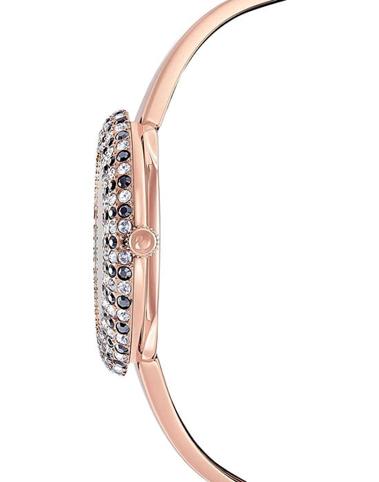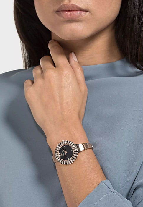 Женские часы Swarovski Crystal Rose 5484050 – это элегантные и утончённые часы, отличающиеся непревзойдённым сиянием. БезельБезельВнешний ободок, закрепляющий стекло. В спортивных часах так называется поворотное кольцо с делениями на циферблате, выполняет роль таймера – замеряет отрезки времени на шкале. Неподвижный безель – элемент декора. Однонаправленно вращающийся безель на дайверских часах позволяет фиксировать моменты погружения и выныривания на поверхность. украшен микропаве из 215 кристаллов. Завершающие штрихи уникального дизайна – корпус и браслет из нержавеющей стали с PVDPVDУльтратонкое покрытие наносится в технике вакуумного напыления, сочетает в себе нитрид титана особой прочности со слоем золота или оксида хрома. Несёт в себе декоративную или защитную функцию. покрытием оттенка розового золота и черный циферблат с рисунком в виде солнечных лучей и тремя метками из прозрачных кристаллов. Надежное минеральное стеклоМинеральное стеклоМинеральное стекло представляет собой искусственно выращенный минерал кварца. Такое стекло отличается особой устойчивостью к повреждениям и царапинам. Уступает по некоторым качествам сапфировому стеклу. защищает часы от царапин и долго сохраняет первоначальный внешний вид. Водозащита 50 метров делает часы практичными для повседневного использования.