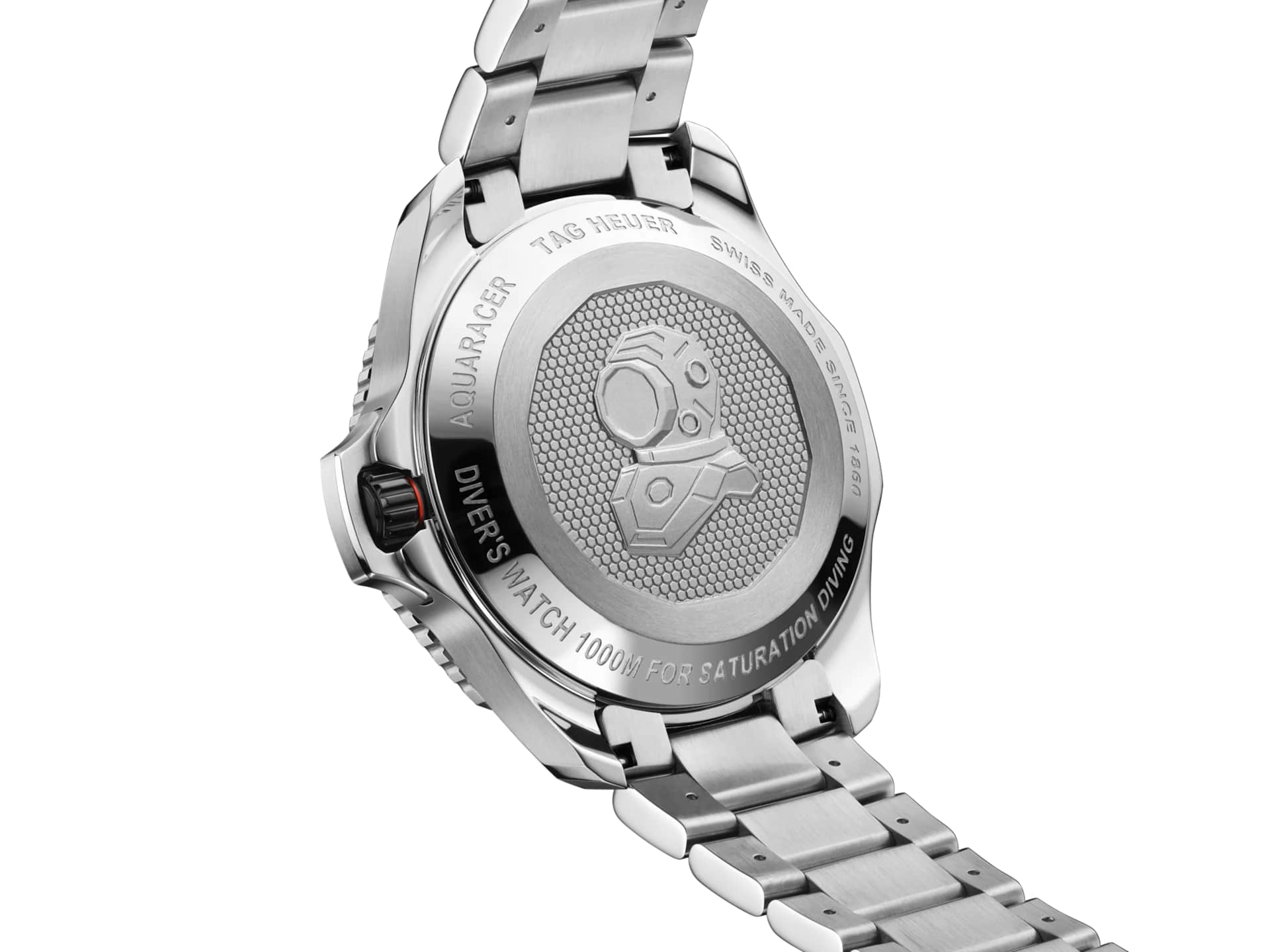 Мужские часы TAG Heuer Aquaracer Professional 200 Date WBP5A8A.BF0619 с 45-миллиметровым титановым корпусом оснащены защитой заводной головки и гелиевым выпускным клапаном, рассчитанным на погружение на глубину 1000 метров. Часы из титана, сертифицированные по стандарту ISO 6425:2018. Циферблат с люминесцентным покрытиемЛюминесцентное покрытиеПозволяет считывать показания времени в темноте. Производители наносят на стрелки, часовые индексы, безель или поверхность циферблата светонакопительный состав, дающий холодное свечение. стрелок и меток, дополнен сапфировым стекломСапфировое стеклоПрочный и надёжный материал из кристалла сапфира синтетического происхождения, характеризующийся особой твёрдостью и устойчивостью к царапинам и повреждениям., устойчивым к появлению царапин и обладающее высокой прозрачностью.