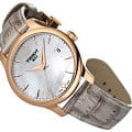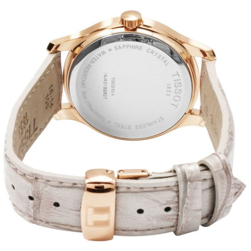 TISSOT T0632103711700 T-Classic Tradition Quartz - женские кварцевые наручные часы Корпус этих часов небольшого размера (33 мм) и выполнен из нержавеющей стали L316 с PVD-покрытием цвета розового золота Модель TISSOT T0632103711700 T-Classic Tradition Quartz имеет устойчивое к царапинам сапфировое стекло, ремешок из натуральной кожи коричневого цвета, перламутровый циферблат Калибр механизма: ETA F05111 Класс водозащиты: 30 м / 3 АТМ (защита от брызг и случайных капель) Дополнительные функции и особенности: отображение числа Полная заводская комплектация TISSOT: оригинальные часы, фирменная коробка, инструкция, сервисная книжка, роман о часовой фабрике, миникаталог, замшевый фирменный чехол черного цвета для хранения и/или переноски часов, кассовый и товарный чеки Международная гарантия 2 года Производство и сборка: Швейцария