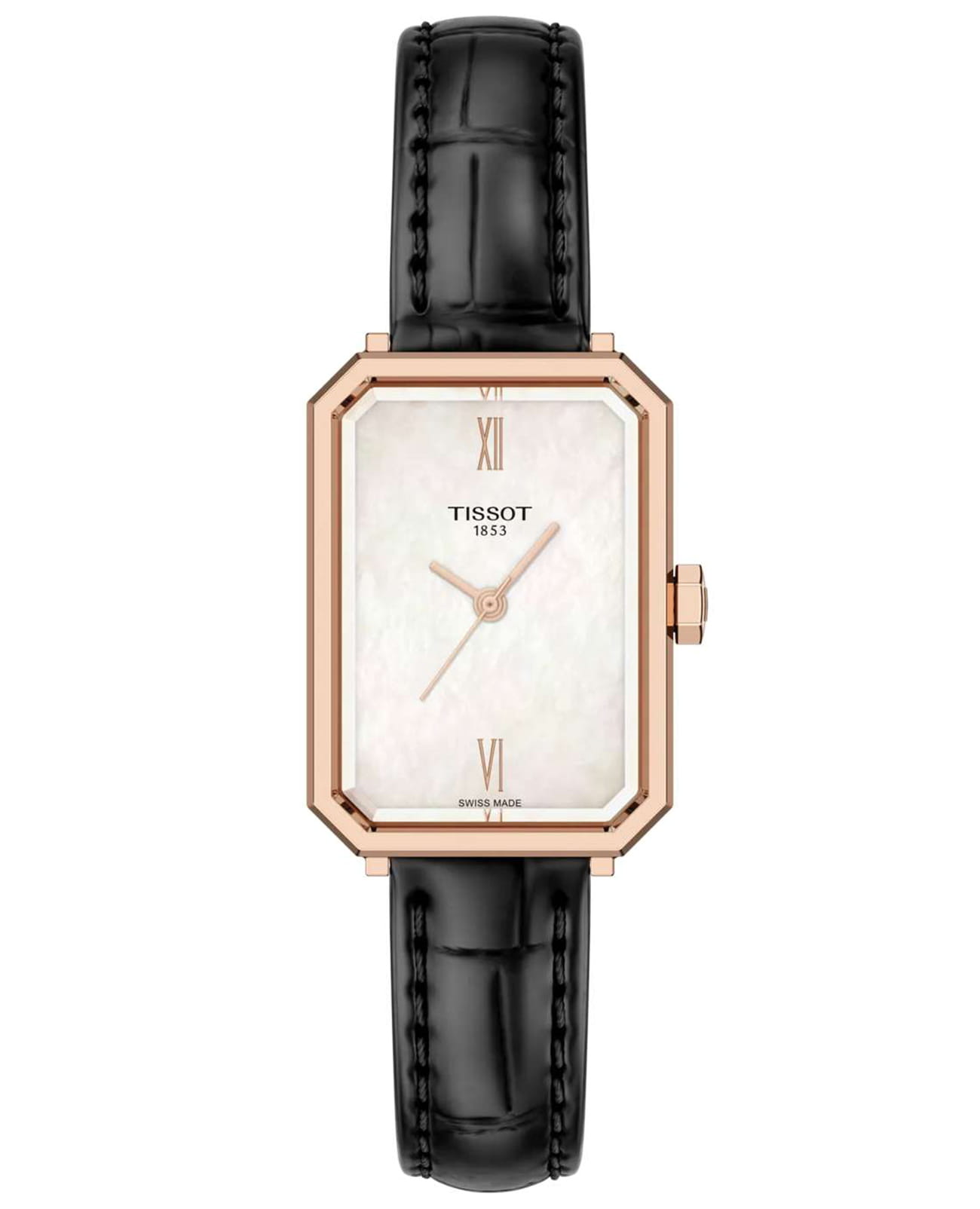 Женские кварцевые часы Tissot — это элегантный аксессуар, вдохновлённый стилем ар-деко 1920-х годов. Модель SRV сочетает геометрические формы и ретро-эстетику с современной технологией. Корпус прямоугольной формы размером 30×21,8 мм выполнен из нержавеющей стали 316L с PVD-покрытиемPVDУльтратонкое покрытие наносится в технике вакуумного напыления, сочетает в себе нитрид титана особой прочности со слоем золота или оксида хрома. Несёт в себе декоративную или защитную функцию. цвета розового золота. Циферблат перламутрового белого цвета оформлен римскими цифрами на позициях 12 и 6 часов. Циферблат защищён сапфировым стекломСапфировое стеклоПрочный и надёжный материал из кристалла сапфира синтетического происхождения, характеризующийся особой твёрдостью и устойчивостью к царапинам и повреждениям. с фасетированной огранкой, повторяющей форму корпуса. Часы оснащены чёрным кожаным ремешком из глянцевой кожи с эффектом лака и классической пряжкой. Благодаря системе быстрой замены ремешок можно легко поменять без использования инструментов. Водонепроницаемость 50 м позволяет использовать часы в повседневных условиях. Идеальный выбор для тех, кто ценит стиль, наследие и швейцарское качество.