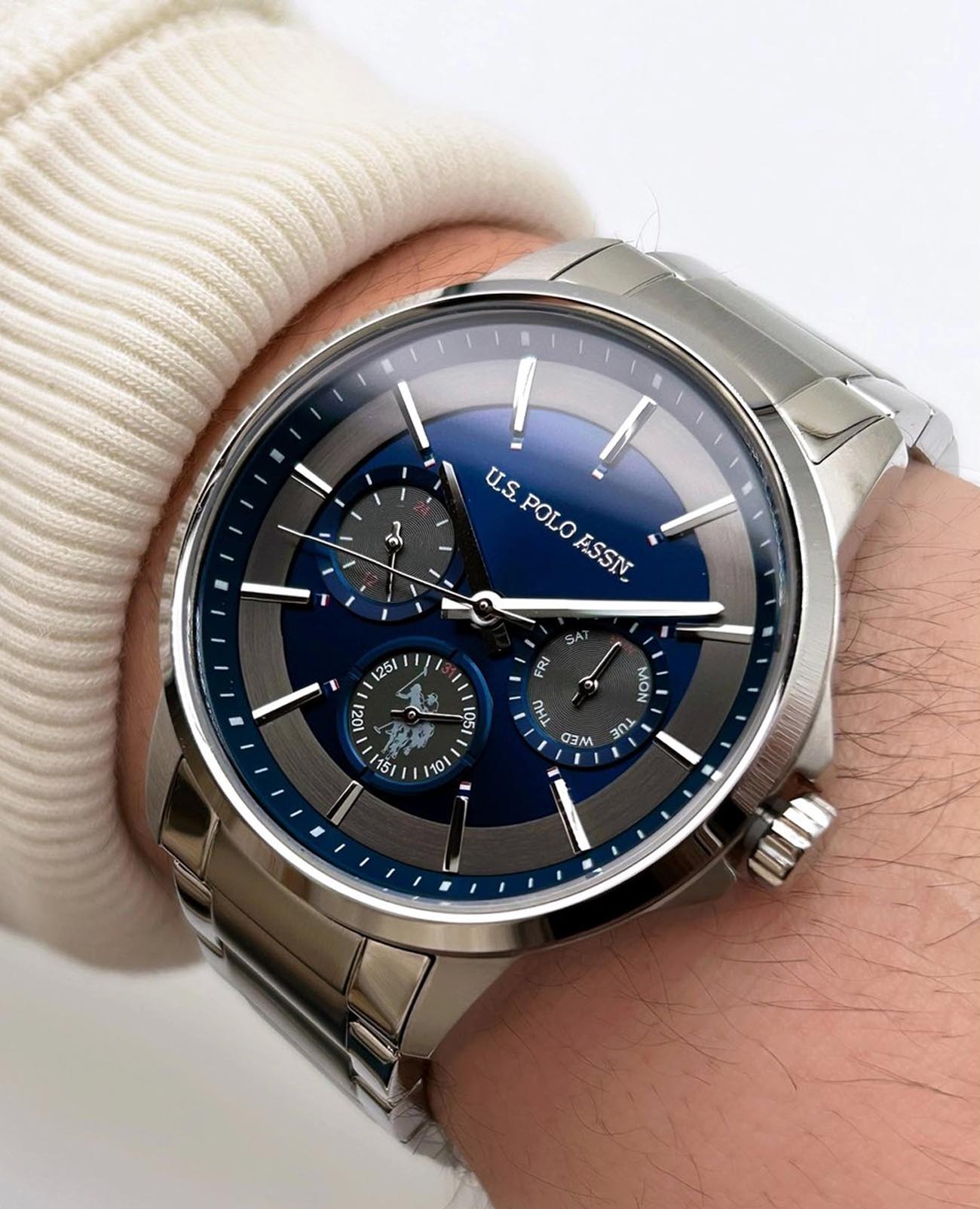 Мужские часы U.S. Polo Assn. Crossing USPA1000-03, кварцевый механизм с высокой точностью. Минеральное стеклоМинеральное стеклоМинеральное стекло представляет собой искусственно выращенный минерал кварца. Такое стекло отличается особой устойчивостью к повреждениям и царапинам. Уступает по некоторым качествам сапфировому стеклу. устойчивое к появлению царапин, обладающее высокой прозрачностью. Корпус и браслет изготовлены из нержавеющей стали. На циферблате три дополнительных индикатора. Центральные часовая, минутная и секундная стрелки. Индикация даты и дня недели. 12/24х часовой формат времени. Класс водозащиты: 50 метров, позволит защитить корпус от случайных брызг или капель дождя. Стальной браслет на застёжке «бабочка» с кнопкамиЗастёжка "бабочка"Такой вид застёжки дополняется предохранителями, помогающими избежать случайного раскрытия браслета. Обладают изящным исполнением. .
