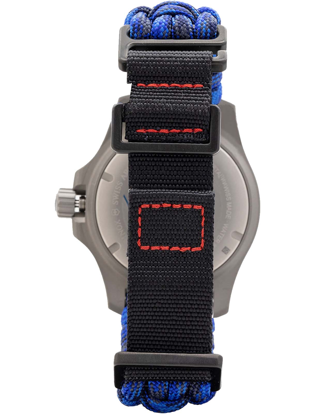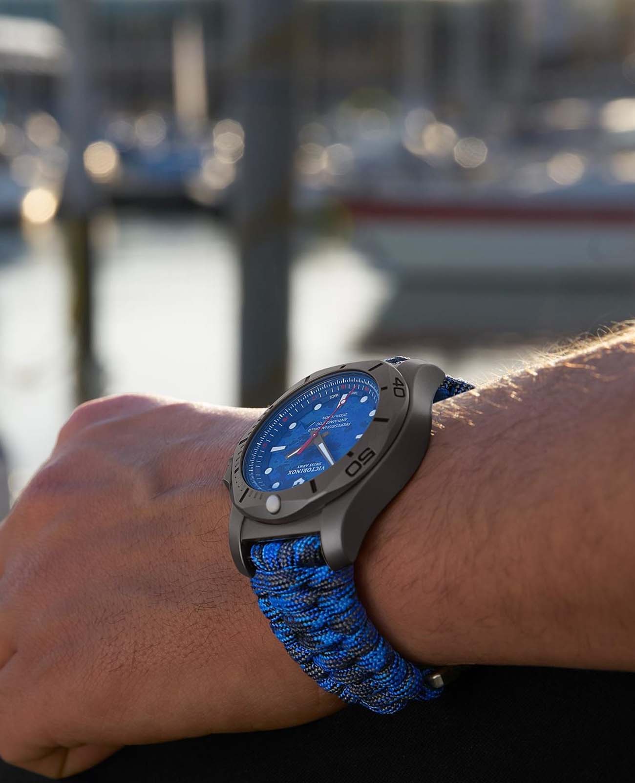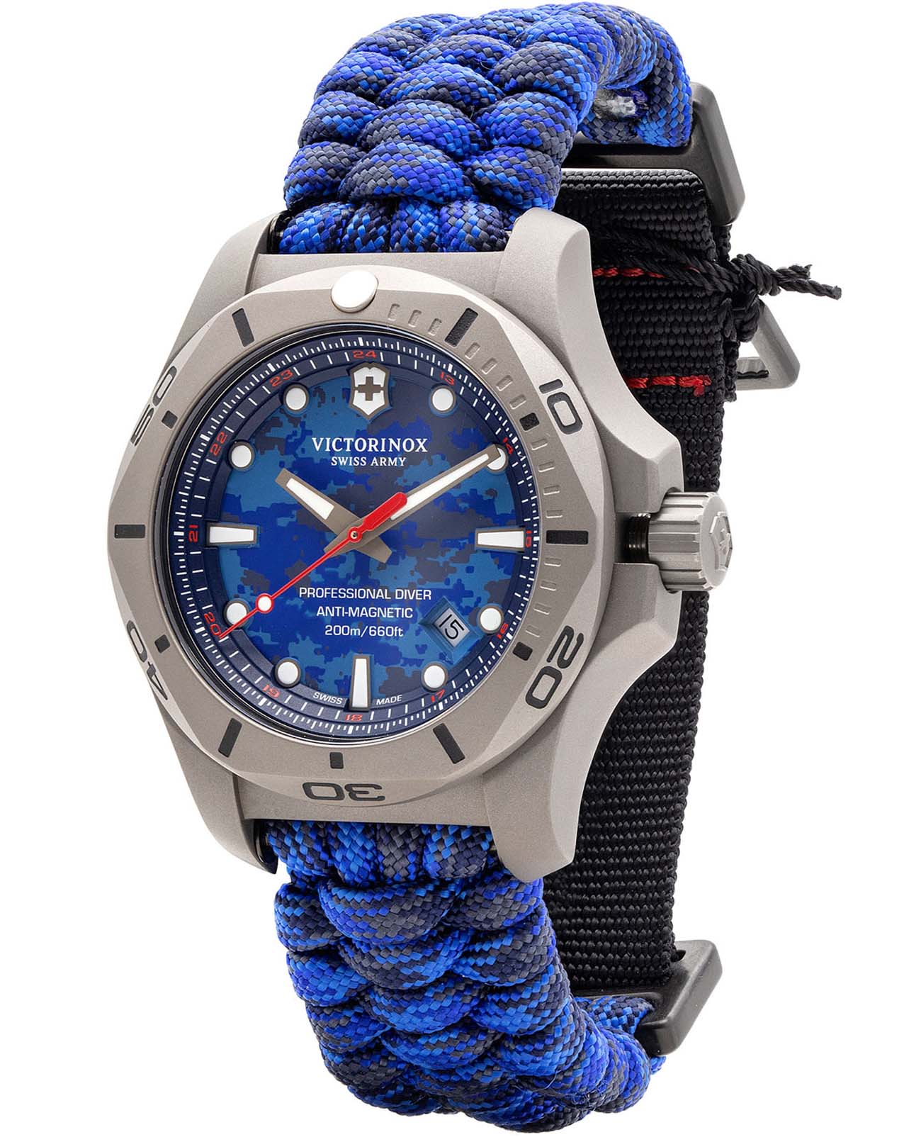 Мужские швейцарские часы Victorinox I.N.O.X. 241813.2. Сапфировое стеклоСапфировое стеклоПрочный и надёжный материал из кристалла сапфира синтетического происхождения, характеризующийся особой твёрдостью и устойчивостью к царапинам и повреждениям. с трёхслойным антибликовым покрытием. Корпус часов выполнен из нержавеющей стали 316L. Ремешок изготовлен из плетенной паракордовой стропы, длиной 2,5 метра и способной выдержать 250 кг. Влагозащита: 200 метров, позволит плавать, нырять и заниматься другими водными видами спорта. Окошко даты находится в положении между 4 и 5 часов. Стрелки и метки с люминесцентным покрытиемЛюминесцентное покрытиеПозволяет считывать показания времени в темноте. Производители наносят на стрелки, часовые индексы, безель или поверхность циферблата светонакопительный состав, дающий холодное свечение.. В комплекте съемный защитный бампер с увеличительным стеклом и резиновый ремешок.