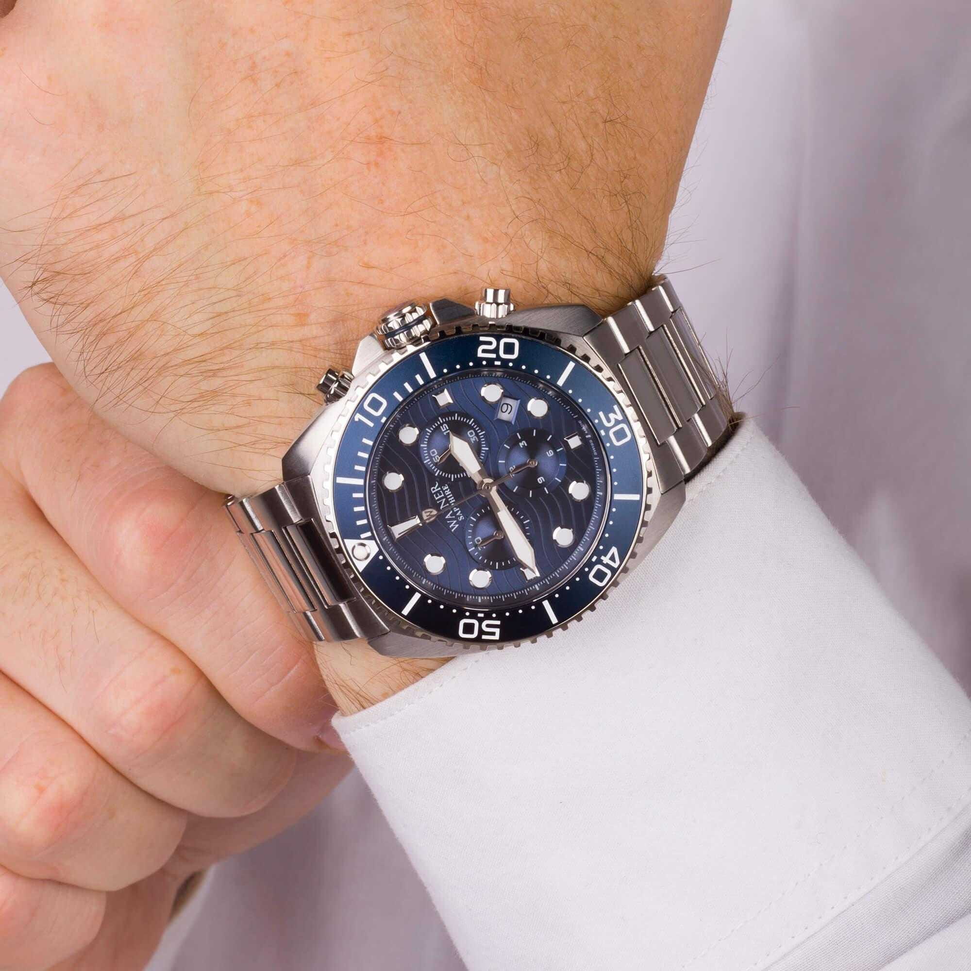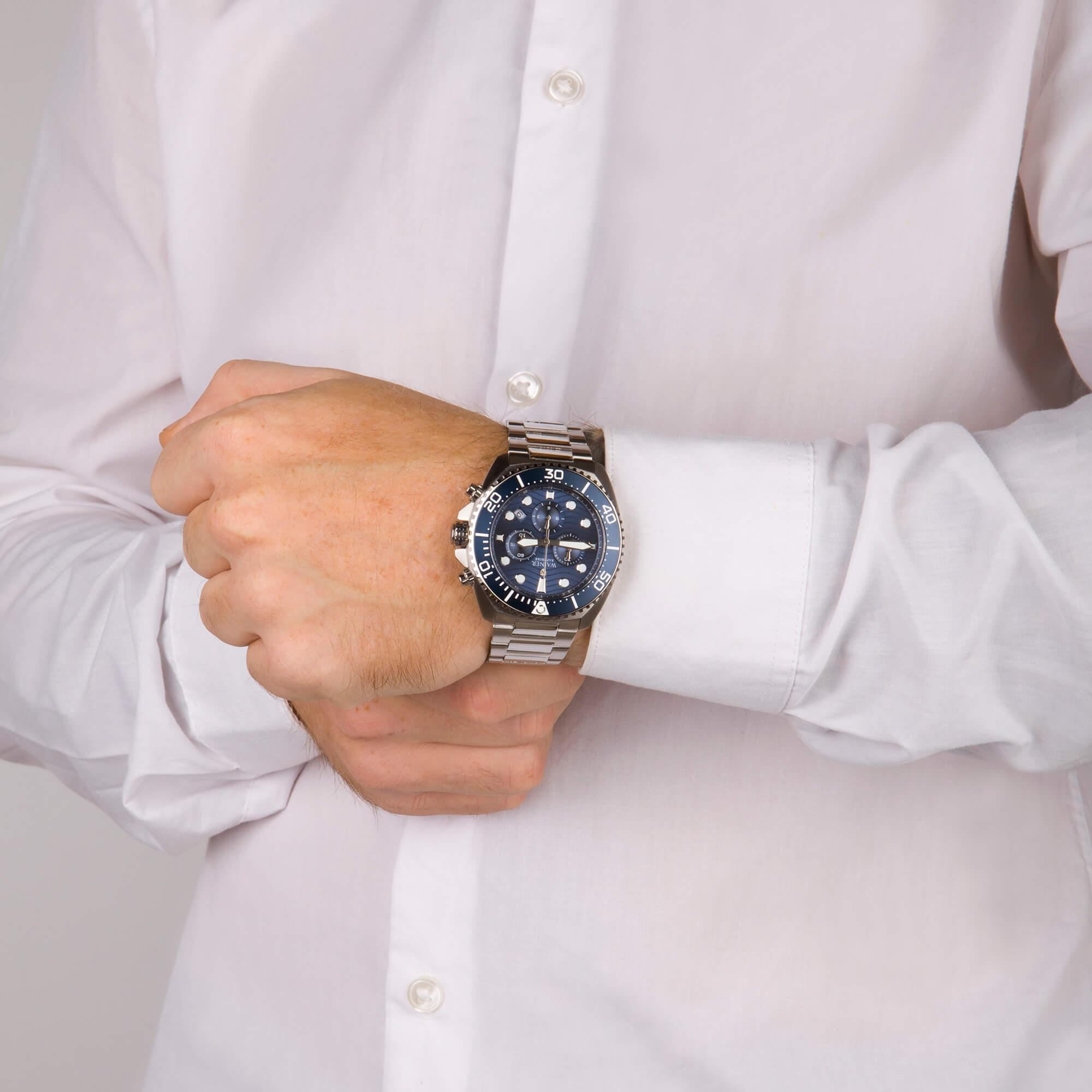 Швейцарские наручные часы Wainer WA.10300-B с хронографомХронографФункция позволяет измерять отрезки времени с особой точностью: часы, минуты, секунды. Верным признаком хронографа является наличие на циферблате 3 дополнительных окошек-счётчиков.. Кварцевый механизм с высокой точностью. Сапфировое стеклоСапфировое стеклоПрочный и надёжный материал из кристалла сапфира синтетического происхождения, характеризующийся особой твёрдостью и устойчивостью к царапинам и повреждениям. устойчивое к появлению царапин, обладающее высокой прозрачностью. Стрелки с люминесцентным покрытиемЛюминесцентное покрытиеПозволяет считывать показания времени в темноте. Производители наносят на стрелки, часовые индексы, безель или поверхность циферблата светонакопительный состав, дающий холодное свечение.. Класс водозащиты: 50 метров, позволит защитить корпус от случайных брызг или капель дождя. Корпус часов изготовлен из нержавеющей стали. Браслет с раскладной застёжкойРаскладная застёжкаТакой тип застёжки используется только на браслетах из металла. Она никогда не раскрывается полностью, происходит разделение на 2 и более частей. Раскладывающая застёжка снизит вероятность потери часов к минимуму..БезельБезельВнешний ободок, закрепляющий стекло. В спортивных часах так называется поворотное кольцо с делениями на циферблате, выполняет роль таймера – замеряет отрезки времени на шкале. Неподвижный безель – элемент декора. Однонаправленно вращающийся безель на дайверских часах позволяет фиксировать моменты погружения и выныривания на поверхность. с IP-покрытиемIP-покрытиеМетод ионного напыления. Демонстрирует повышенную устойчивость к истиранию, окислению и химическим веществам. Под воздействием высокого давления и температуры около 1500°C молекулы металла надёжно соединяются с частицами корпуса часов..