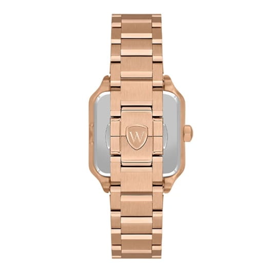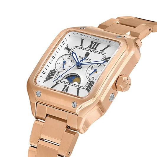 Женские кварцевые часы Wainer Vintage — это изысканный аксессуар, сочетающий в себе швейцарское качество и элегантный дизайн. Модель выполнена в квадратной форме из нержавеющей стали 316L с PVD-покрытиемPVDУльтратонкое покрытие наносится в технике вакуумного напыления, сочетает в себе нитрид титана особой прочности со слоем золота или оксида хрома. Несёт в себе декоративную или защитную функцию., что придаёт ей устойчивость к царапинам и благородный внешний вид. Циферблат белого цвета дополнен индикатором фазы Луны, датой и днём недели, а его поверхность защищена сапфировым стекломСапфировое стеклоПрочный и надёжный материал из кристалла сапфира синтетического происхождения, характеризующийся особой твёрдостью и устойчивостью к царапинам и повреждениям., устойчивым к повреждениям. Гранёная заводная головка с защитой обеспечивает надёжную фиксацию на запястье. Браслет из стали с покрытием шириной 16 мм оснащён Раскладная застёжкаРаскладная застёжкаТакой тип застёжки используется только на браслетах из металла. Она никогда не раскрывается полностью, происходит разделение на 2 и более частей. Раскладывающая застёжка снизит вероятность потери часов к минимуму., обеспечивающей комфорт и надёжную фиксацию. Часы водонепроницаемы до 50 метров (, что позволяет использовать их при мытье рук или под лёгким дождём. Стрелки и индексы имеют Люминесцентное покрытиеЛюминесцентное покрытиеПозволяет считывать показания времени в темноте. Производители наносят на стрелки, часовые индексы, безель или поверхность циферблата светонакопительный состав, дающий холодное свечение., обеспечивающее отличную читаемость даже в условиях слабого освещения. Механизм калибра Ronda 706.1 гарантирует точность хода и надёжность. Эти часы станут универсальным аксессуаром для тех, кто ценит сочетание стиля, функциональности и швейцарского мастерства — идеальный выбор для повседневной носки и торжественных случаев.